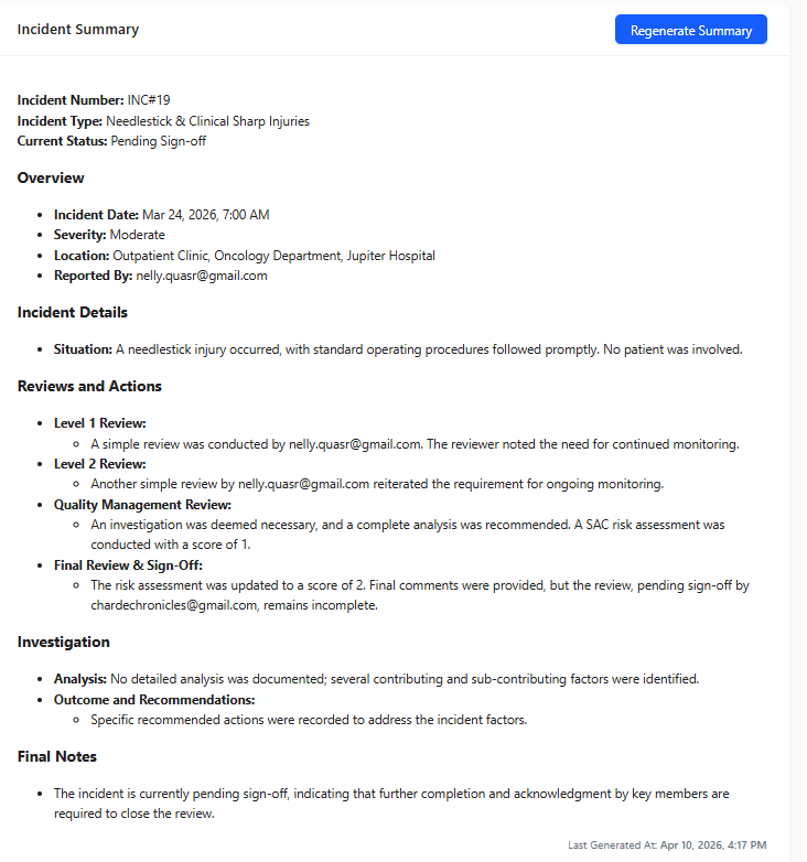 QUASR+ AI Incident Summarisation ensures that every incident becomes a clear, actionable insight – empowering teams to review faster, learn continuously, and improve patient safety outcomes